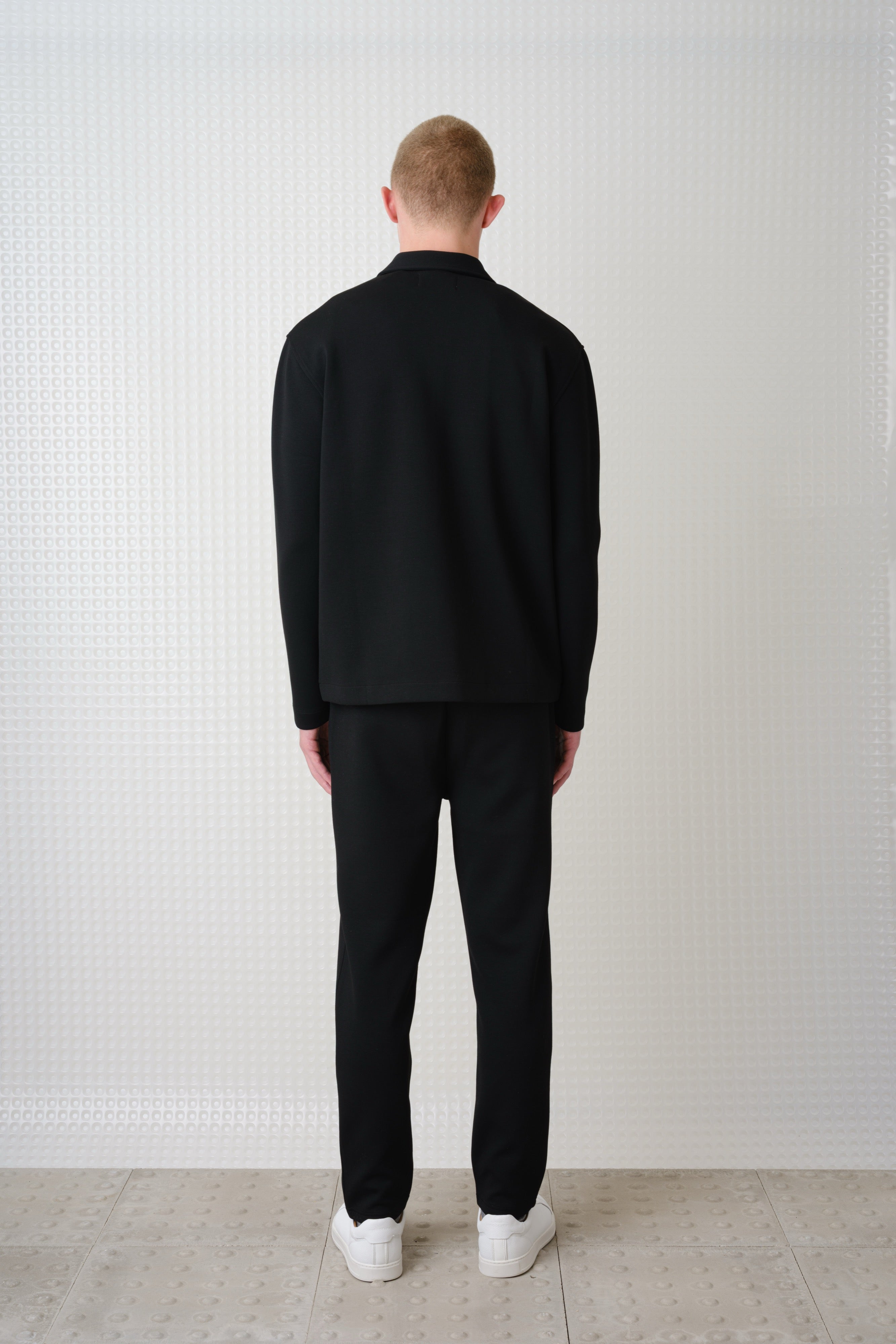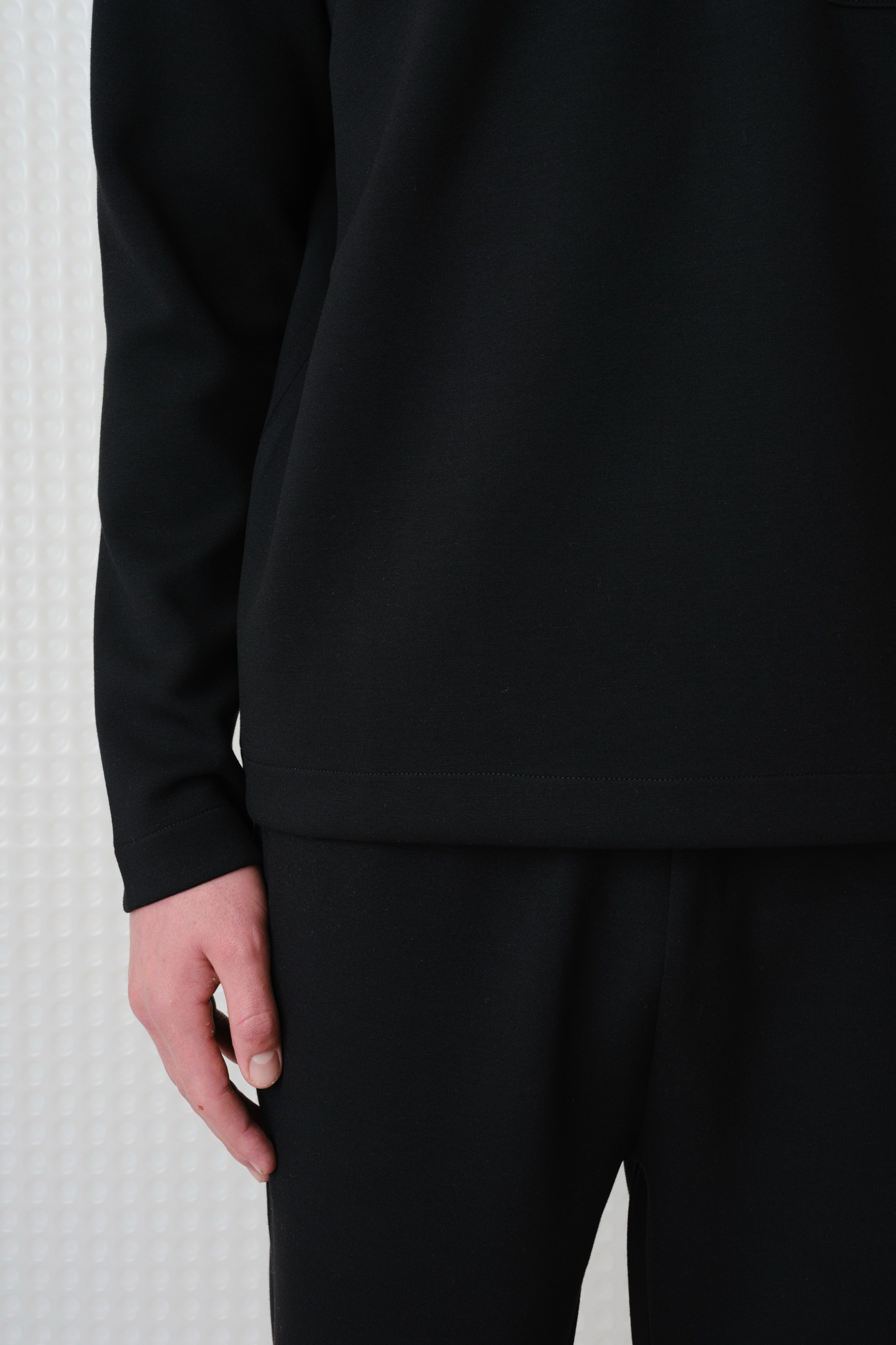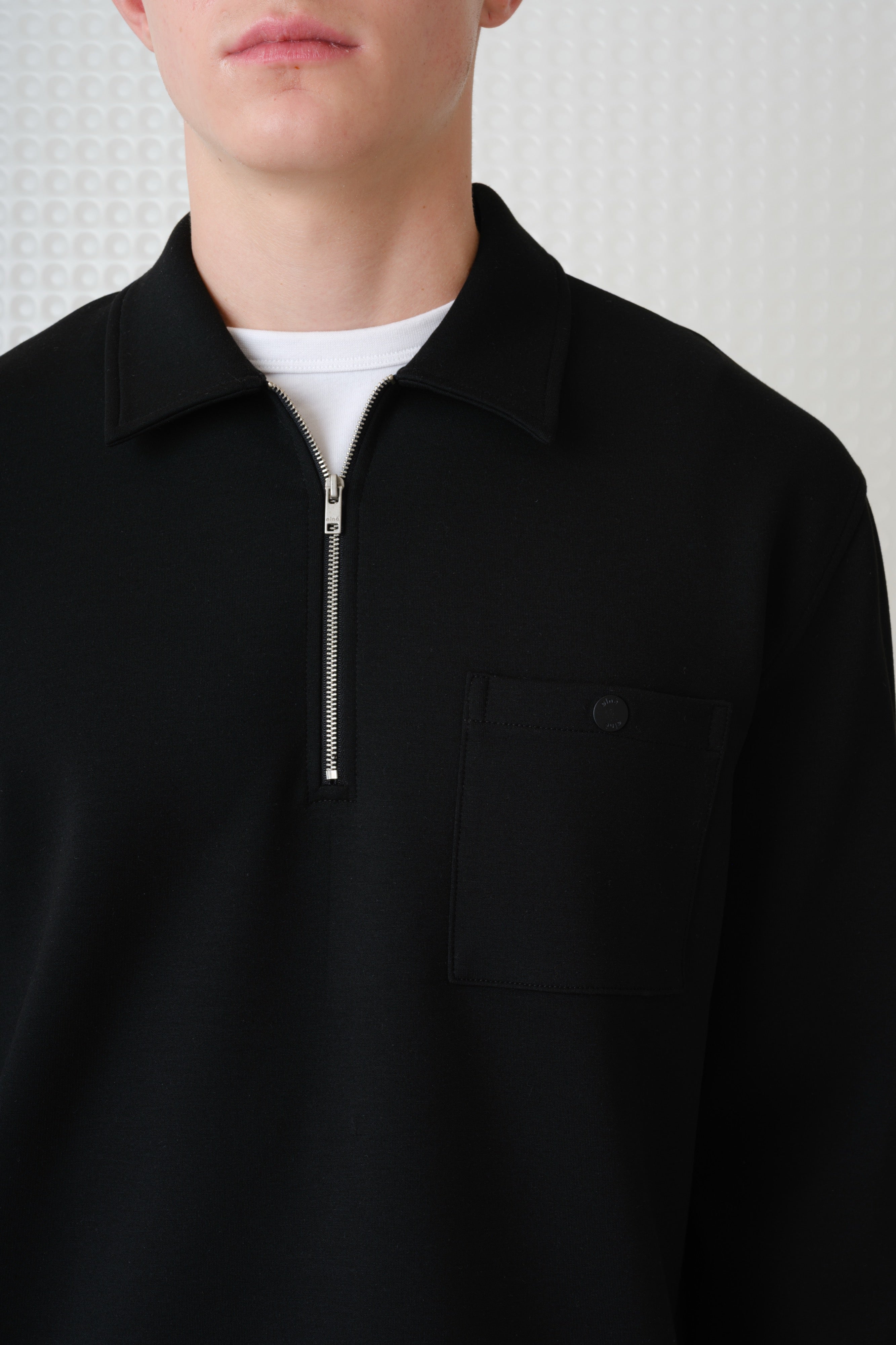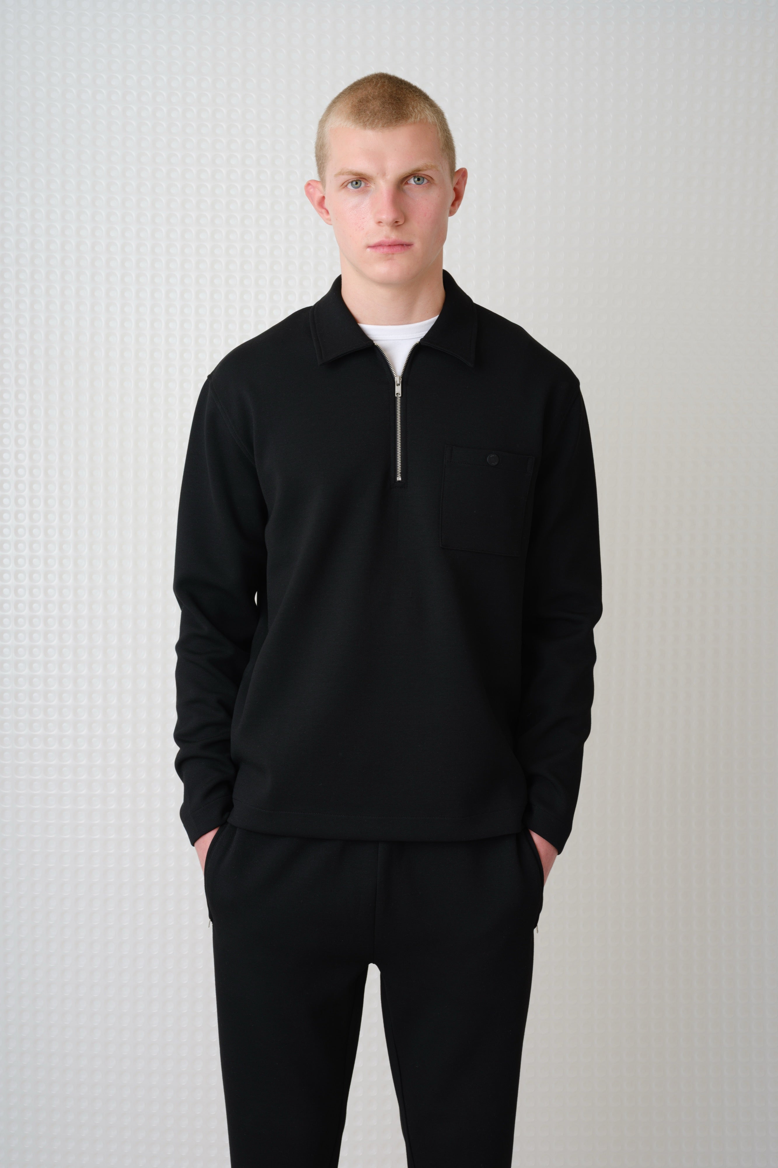 Quarter zip sweat with collar in bonded jersey.    72% Polyester, 22% Viscose, 6% Elastane