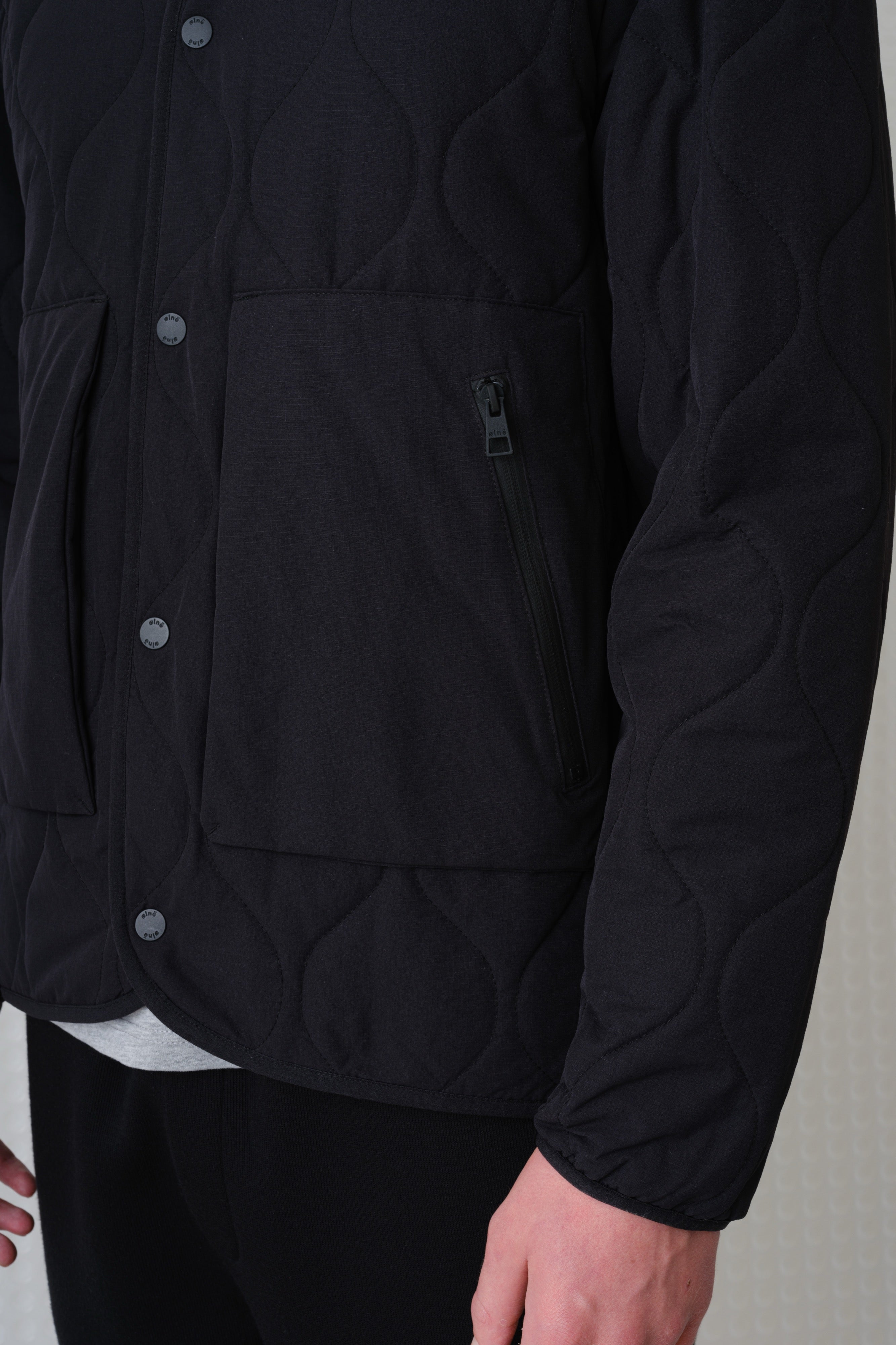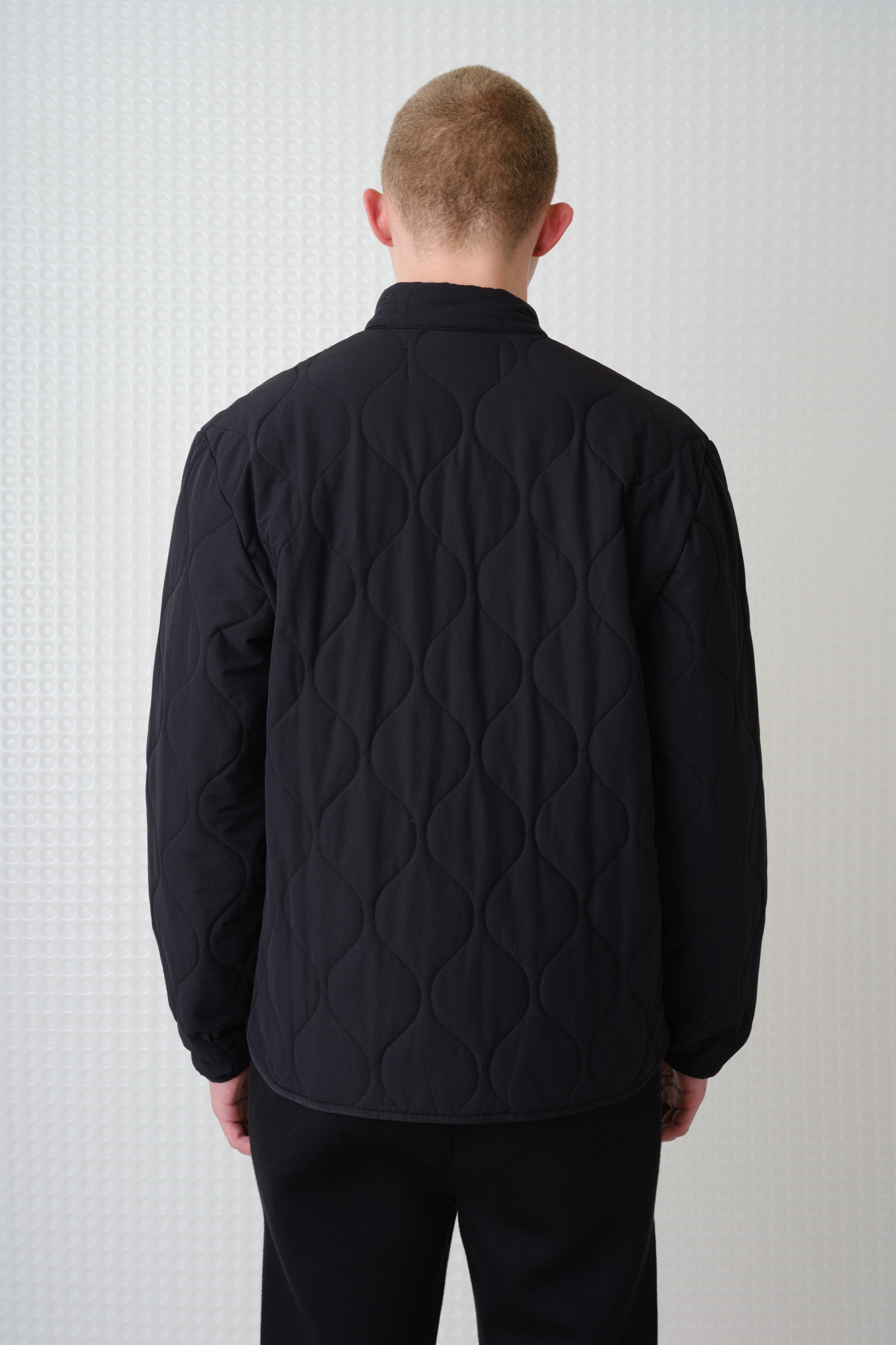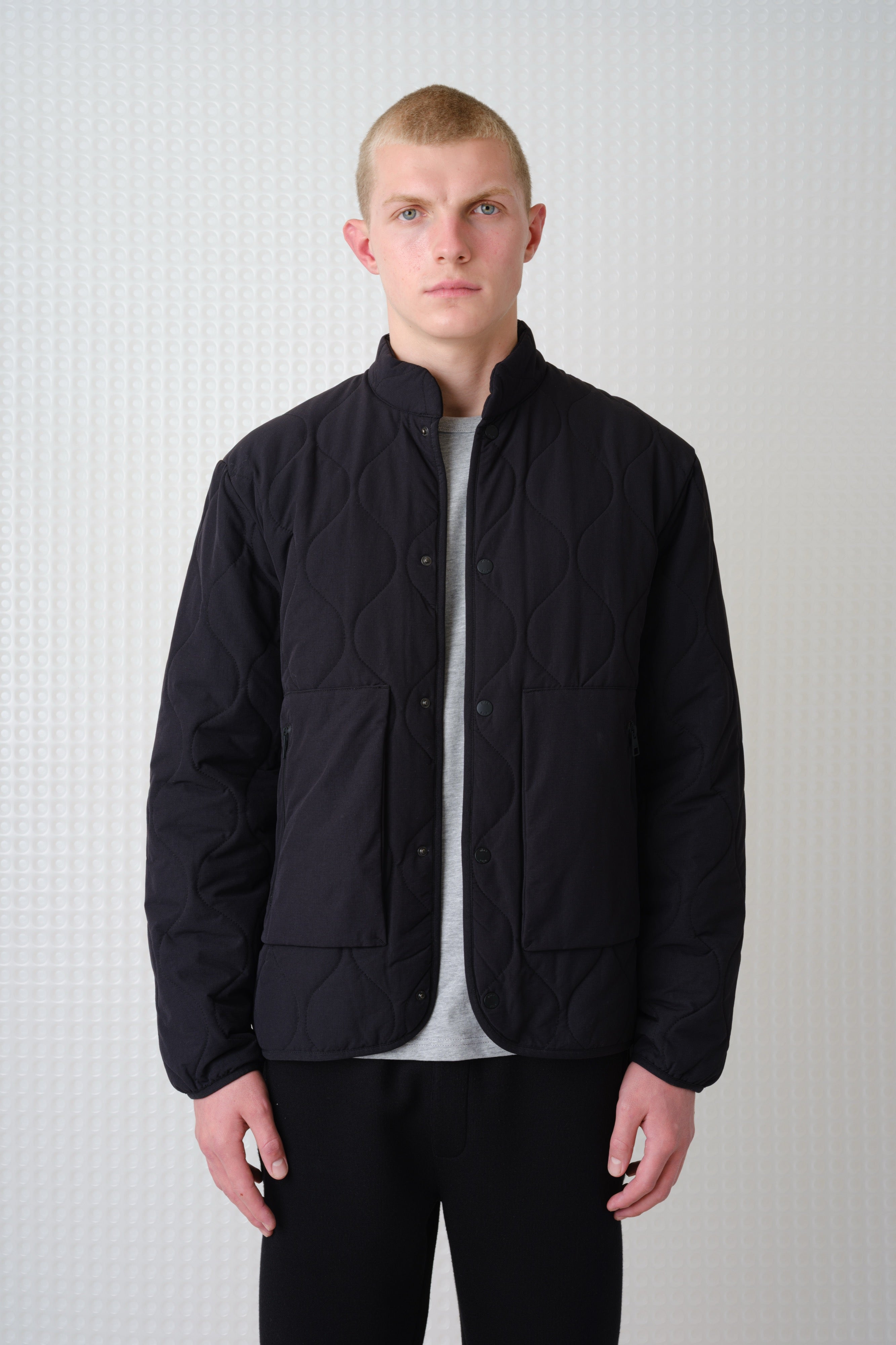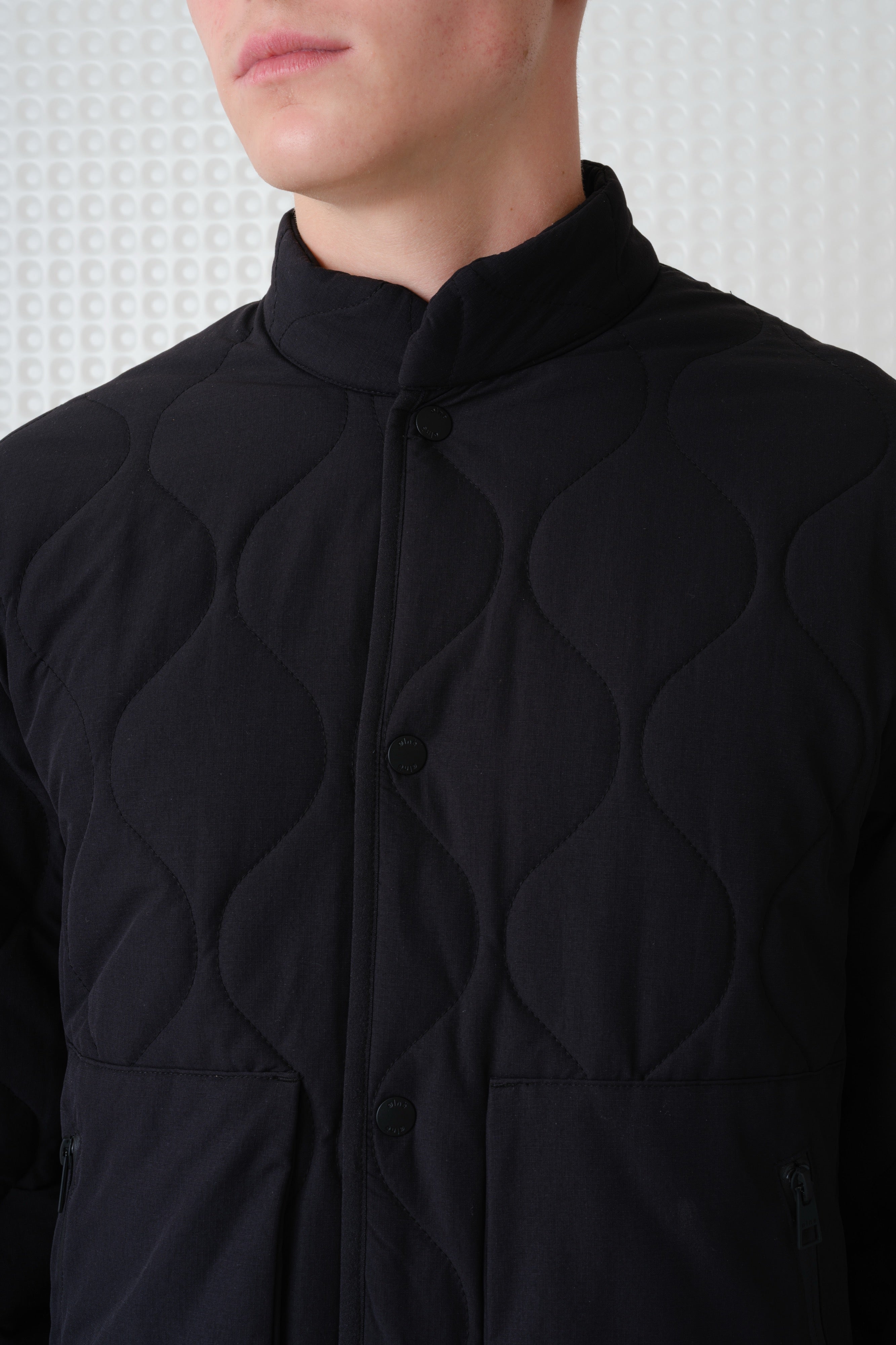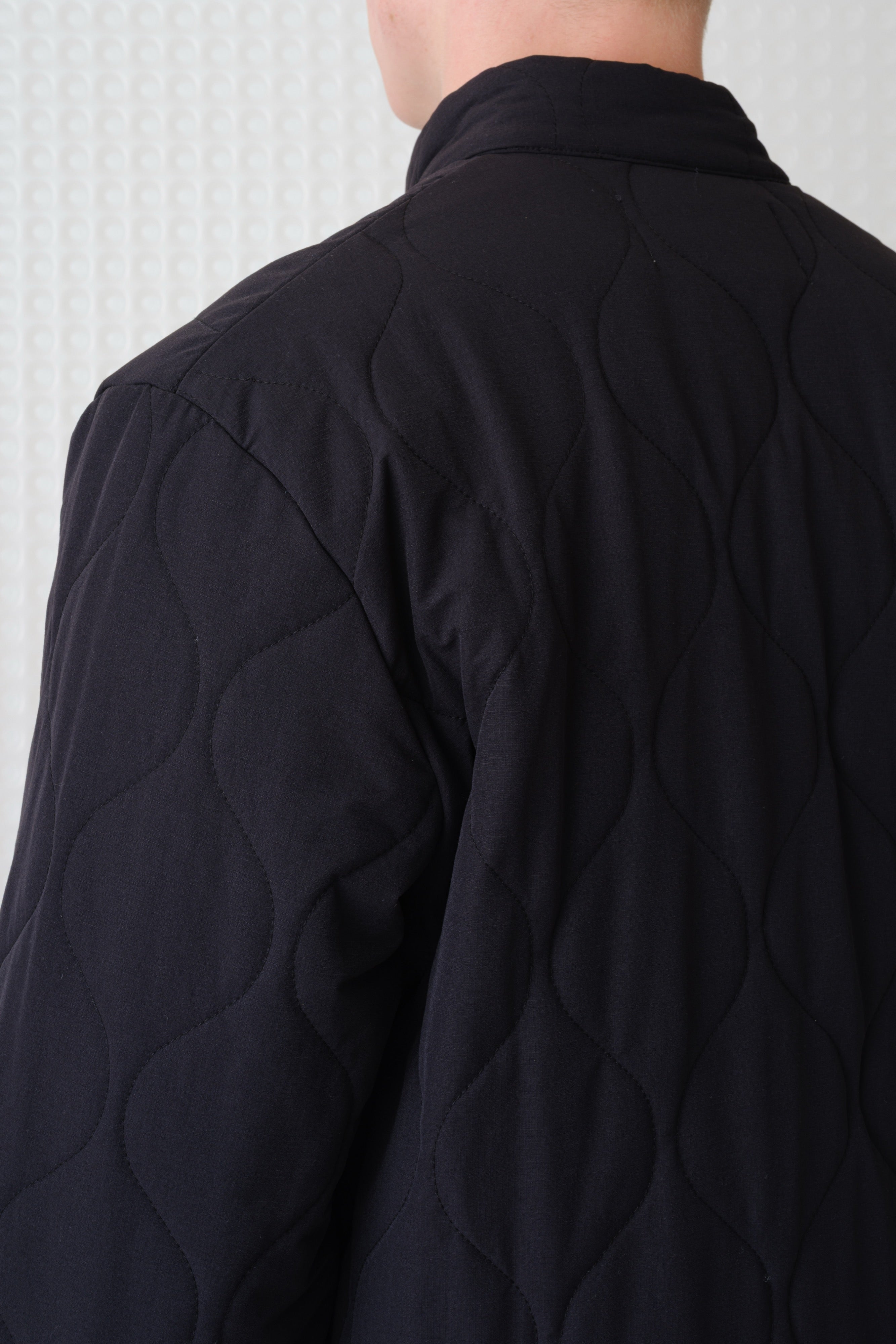 Textured wadded jacket with stand collar. 92% Nylon, 8% Elastane